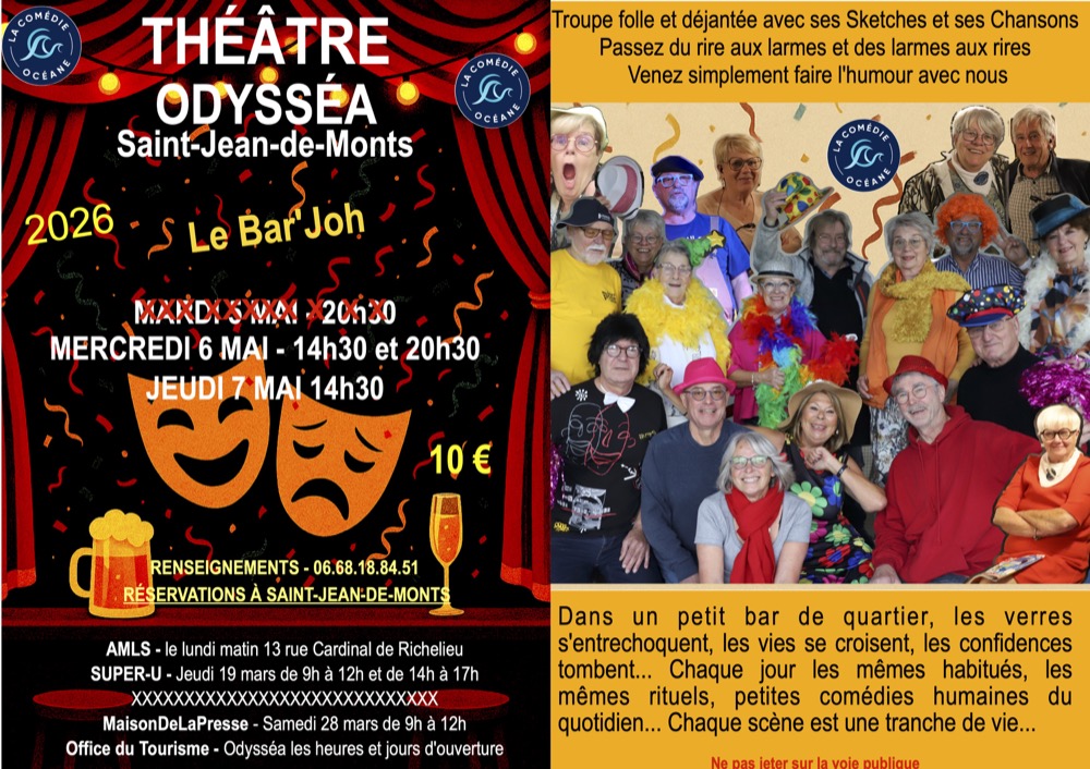 • THÉÂTRE – LA COMÉDIE OCÉANE – Cette Semaine – OUVERTURE DE LA BILLETERIE du Bar’Joh à l’AMLS de 9h30 à 12h, affiche en fin d’Article rubrique Saint-Jean et Ailleurs – Tarif 10€ – Attention Places disponibles les mercredi 6 14h30 et 20h30 et jeudi 7 mai 14h30.
